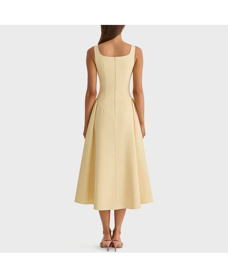 1. Fabric Analysis: This yellow square neck sundress is made of a blend of 94% polyester and 4% spandex. Polyester provides the fabric with crispness and abrasion resistance, while also offering high colorfastness, making it resistant to fading or deformation; spandex increases the fabric's elasticity, allowing the dress to fit the body's curves more comfortably and freely.