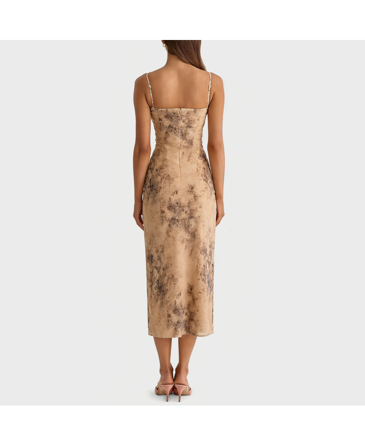 Fabric Analysis: This dress is made of lightweight and breathable mesh fabric, which is soft, drapes naturally, and is comfortable to wear. The light and flowing mesh material adds layers and a sheer aesthetic to the dress. The overall effect is breathable and lightweight, with a clear and natural ink-wash print design on the fabric, combining artistic and modern elements, visually resembling a delicate painting and adding a romantic touch.