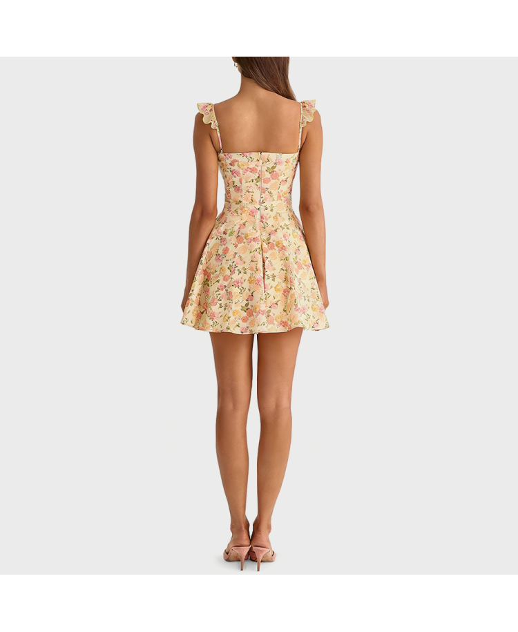 1. Fabric Analysis: This dress is made of 100% polyester, a lightweight and soft fabric with a natural drape for comfortable wear. Polyester is durable, wrinkle-resistant, easy to wash and care for, maintaining the dress's shape while boasting high colorfastness, ensuring the yellow-based pink floral print remains vibrant and long-lasting. The dress is lined for added smoothness and comfort, effectively preventing see-through issues and enhancing its overall quality.