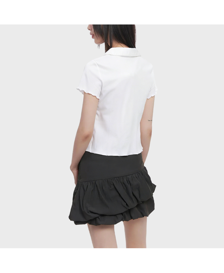 1. Fabric Analysis: This short-sleeve top with a ruffled collar is made of soft, comfortable, and skin-friendly fabric with good breathability, making it suitable for spring, summer, and early autumn. The fabric has some elasticity, ensuring comfort and preventing deformation. The solid color design is simple and elegant, easy to match with everyday outfits, and the overall style is clean and crisp.