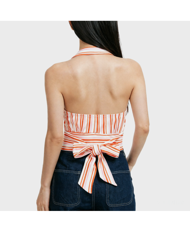 3. Halter-Neck Design: The top features a halter-neck design, securing it at the neckline to showcase the shoulder and neck lines and the curve of the back. The halter-neck style is lightweight and dynamic, adding a touch of fashion and making the shoulder lines appear more graceful and elegant.